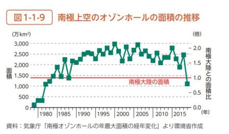 1980年代から90年代にかけて大きく広がったオゾン層の破壊。世界規模での取り組みを行っているが、破壊は今も続いており、有害な紫外線が増加し人体への健康被害などが懸念されている。各国の努力により、横ばいが続いていたオゾンホールの面積が、近年ようやく縮小に向かい、南極大陸の広さを下回り始めた。 令和2年6月 環境省 令和...