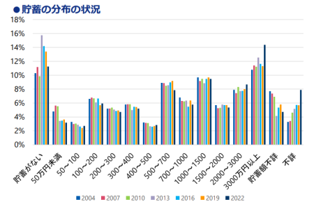 データ解説74365歳以上世帯の貯蓄額の推移世帯主年齢65歳以上の世帯における貯蓄がない世帯の割合は、2013年まで増加していたものの、その後、減少傾向となっています。しかし、貯蓄のある世帯と比べて、その割合は高くなっています。 出典:厚生労働省 第108回社会保障審議会介護保険部会 資料 令和5年11月6日