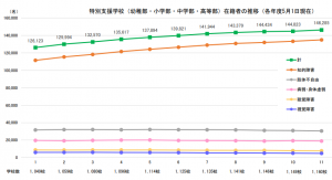 特別支援学校に通う児童の数は、徐々に増加してきています。肢体不自由、病弱・身体虚弱、聴覚障害、視学障害の数は横ばいなのに対して、知的障害の数が増加しています。