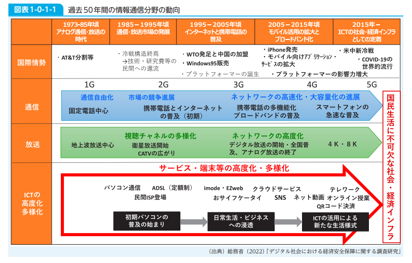 情報通信白書は1973年から刊行され、今年で50年目となります。刊行が始まった1973年当時から現在までの推移をみると、情報通信技術(ICT)が高度化し、様々なサービスやビジネスが登場。ICTが社会・経済インフラとして不可欠なものとなっていることが分かります。ICTを取り巻く状況がどのように変化したかが紹介されています。