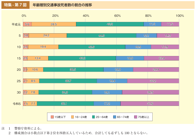 年齢層別に交通事故死者数の割合を見ると、65歳以上の交通事故死者数が交通事故死者数全体に占める割合は、平成元年は22.7%でしたたが,平成25年に50%を超え、令和5年は54.7%となっており、高い割合で推移しています。特に75歳以上の割合は平成元年から増加し続けています。
