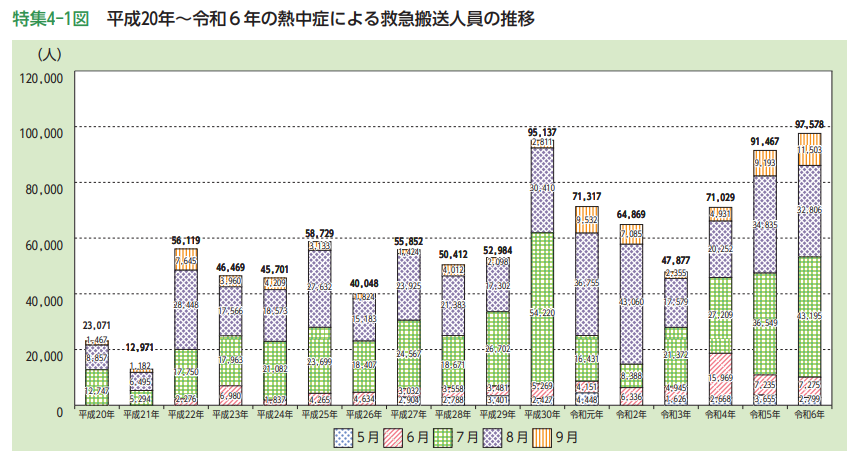 14Oct2025【白書紹介シリーズ25-15】消防白書2025年10月14日20約1分白書・報告書令和6年は、非常に厳しい暑さが長期間にわたって続いたことから、5月から9月までにおける全国の熱中症による救急搬送人員は9万7,578人となり、集計を開始した平成20年以降、最多となりました。 https://www.fdma.go.jp/publication/hakusho/r6/68138.html