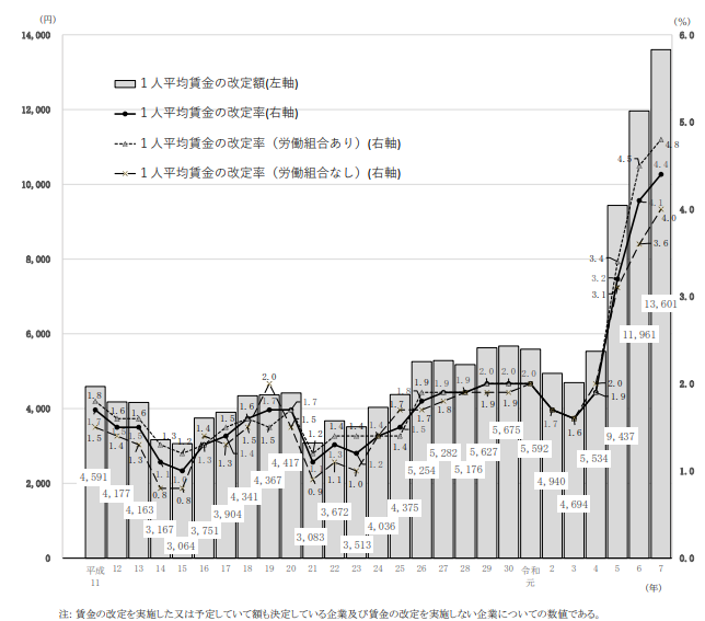 29Oct2025平均賃金の改定額・改定率の推移2025年10月29日12約1分データ解説1人当たりの平均賃金の改定額・改定率ともに、平成23年以降増加傾向で推移し、令和2年・3年に減少するものの、その後は増加をし続けています。令和7年の1人当たりの平均賃金の改定額は13,601円で、改定率は4.4%でした。 出典:政策統括官付参事官付賃金福祉統計室「令和7年賃金引上げ等の実態に関する調査の概況」 令和7年10月14日