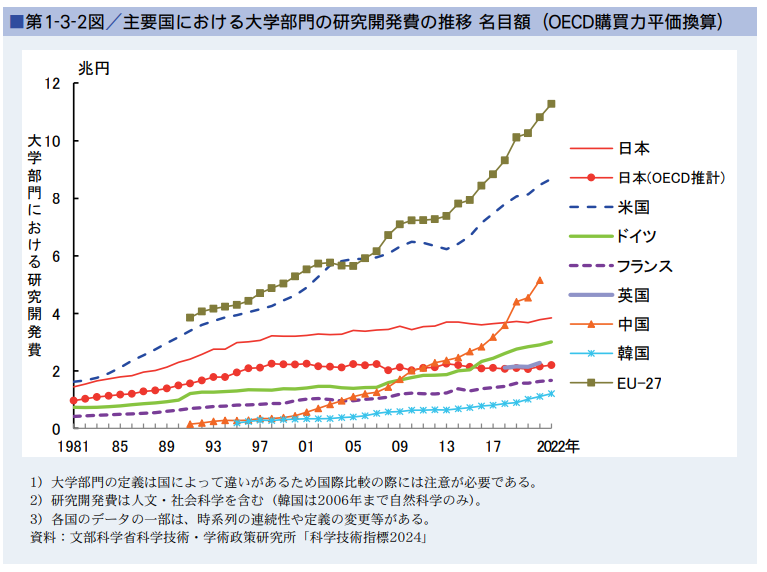 基礎研究の中心的な現場である大学部門の研究開発費の推移を見ると、主要国の研究開発費が増加する中で、日本は横ばいの状況が続いています。科学技術・イノベーションの推進のためには、大学等が安定的・継続的に教育研究活動を実施するための基盤的経費が重要です。