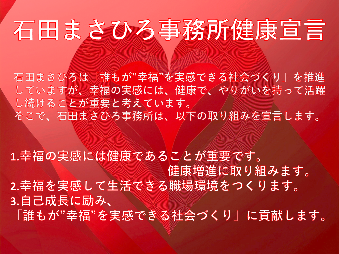 そこで、石田事務所では、健康経営を推進し、経産省の「健康経営優良法人認定制度」の趣旨に沿った取り組みを行っています。