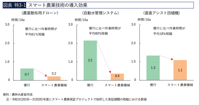 農林水産省は、全国217地区でスマート農業技術の実証を行い、その効果を検証しています。結果、農薬散布用ドローンで作業時間が61%、自動水管理システムで80%、直進アシスト田植機で18%短縮されるなど、労働負担の大幅軽減が確認されました。これにより、生産性向上や経営改善に加え、女性や高齢者、新規就農者など多様な人材の参入促進にもつながっています。