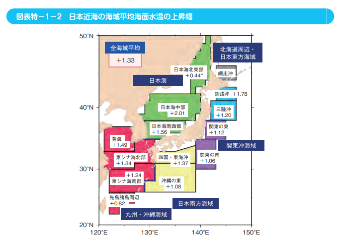 2024年の日本近海の平均海面水温は、前年を上回り、観測開始以来最も高い値となりました。地域によって上昇幅に差があり、日本海中部では+2.01℃/100年、三陸沖では+1.20℃/100年と大きな違いが見られます。こうした海面水温の上昇は、海の中で栄養を循環させる働きや生態系にも影響を及ぼすと考えられています。