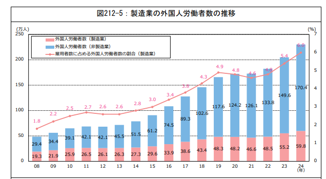 製造業では外国人労働者の増加が続き、2024年には59.8万人と過去最高となりました。技能実習や特定技能など多様な在留資格の人々が活躍しており、雇用者全体に占める割合も6.0%へ上昇。ものづくり現場の担い手として重要な役割を果たしています。