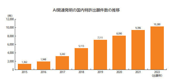 AI(人工知能)関連発明の国内特許出願件数は、2015年の1,362件から2022年には10,280件へと約7.5倍に増加しました。これは第三次AIブームの影響が大きく、機械学習の高度化や計算機性能の向上、データ流通量の拡大などが、AI技術の実用化を進めていると考えられます。