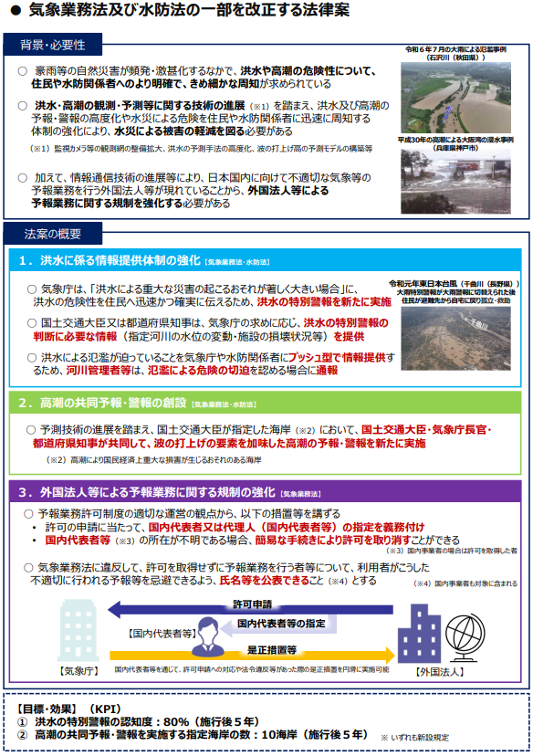 13Nov2025【第219回臨時国会法案解説シリーズ01】気象業務法及び水防法の一部を改正する法律案2025年11月13日10約1分法律・予算近年、大雨に起因する災害が増加していますが、大雨に関する警戒レベルと洪水に関する警戒レベルが一致せず、混乱を生じさせることがありました。そこで、両者の警戒レベルを統一します。また、高潮に関する予報・警報についても、その体制を強化します。 昨今、日本国内に向けて、不適切な気象予報などを行う外国法人が出てきていることから、外国法人等による予報業務に関する規制を強化します。