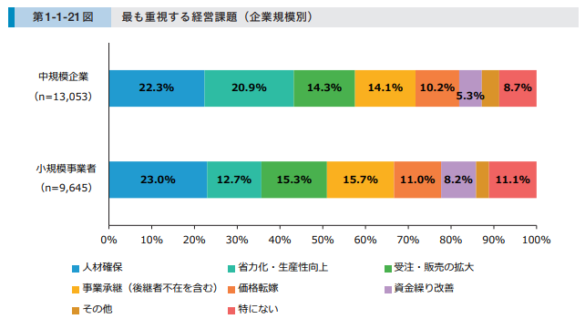 中小企業・小規模事業者が最も重視する経営課題は、いずれも「人材確保」が最多となりました。中規模企業では「省力化・生産性向上」、小規模事業者では「事業承継(後継者不在を含む)」が続き、人材不足への対応が規模を問わず共通の課題であることが示されています。