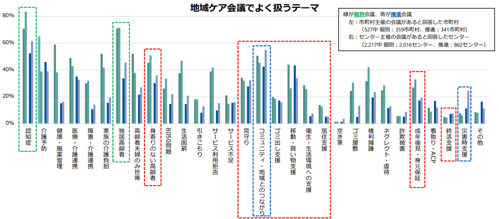 23Jan2026地域ケア会議で扱うテーマ2026年1月23日22約1分データ解説地域ケア会議は、高齢者が住み慣れた地域で自分らしく暮らし続けられるよう、地域の関係者が集まり課題を共有・解決するための会議体です。そのうち、特定の高齢者について話し合うのが個別会議、個別会議で見えた共通課題を話し合うのが推進会議です。 個別会議では認知症や独居高齢者に関する課題が多く扱われ、推進会議では繋がりづくりや災害時支援についても取り組まれています。 出典:厚生労働省第31回社会保障審議会福祉部会「資料2 介護保険部会における議論の状況」 令和7年11月17日