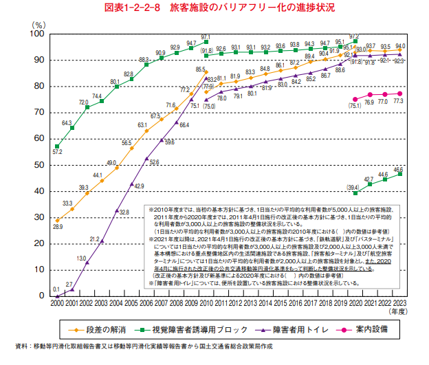 鉄道駅、バスターミナル、旅客船・航空ターミナルなど、1日2,000〜3,000人以上が利用する主要な旅客施設では、バリアフリー化のための段差解消や案内設備、障害者用トイレ、視覚障害者誘導用ブロックなどの整備が求められています。2023年度末時点では、段差解消率94.0%、障害者用トイレ92.3%、案内設備77.3%と高い水準で整備が進んでいます。一方、視覚障害者誘導用ブロックは46.6%にとどまっており、今後の重点分野です。国は2025年度を期限とした整備目標を掲げ、誰もが安心して移動できる環境づくりを加速しています。