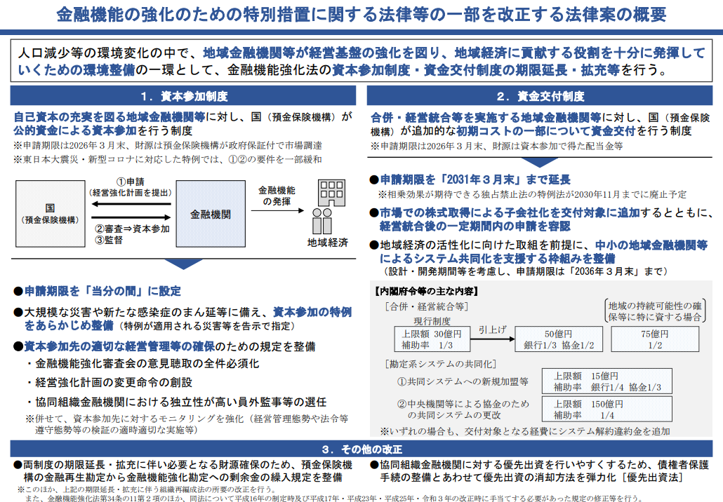 6Mar2026【第220回特別国会法案解説シリーズ01】金融機能の強化のための特別措置に関する法律の一部を改正する法律案2026年3月6日26約1分法律・予算地域金融機関等の経営基盤の強化を図り、地域経済への貢献を進めます。 そのために 自己資本の充実を図る地域金融機関等に対し、国が公的資金による資本参加を行う制度の充実 合併や経営統合等を実施する地域金融機関等に対し、国が初期コストの一部を資金交付する制度の延長・充実 等を進めます。