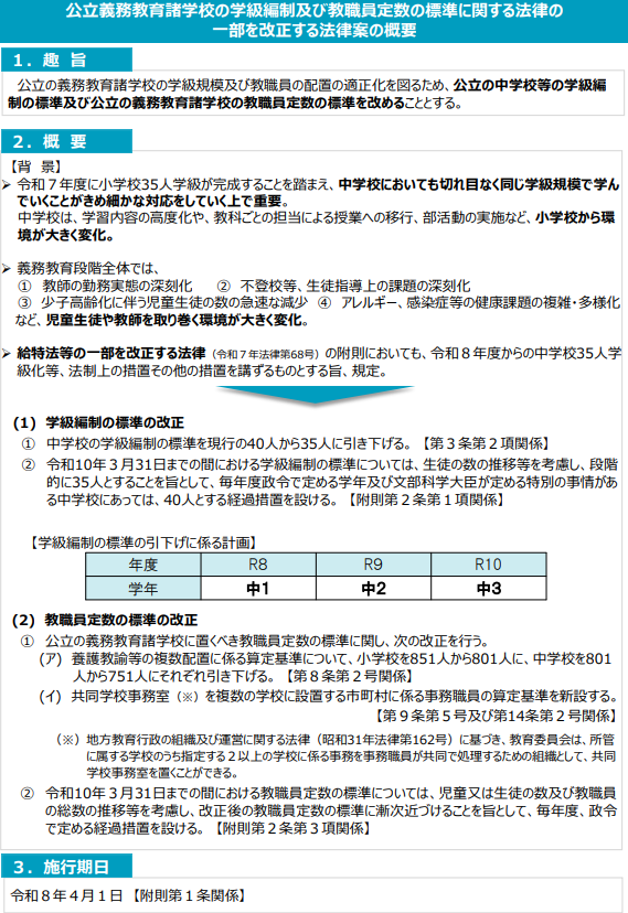 18Mar2026【第220回特別国会法案解説シリーズ04】公立義務教育諸学校の学級編制及び教職員定数の標準に関する法律の一部を改正する法律案2026年3月18日16約1分法律・予算小学校では令和7年に35人学級を達成しましたが、この法改正では中学校においても35人学級を順次確立します。 また、養護教諭の複数配置の基準の引き下げ、共同学校事務室の算定基準の見直しも行います。