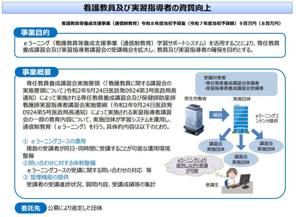 看護教員等の養成における通信制教育(eラーニング)の実施に必要な経費に対する支援を行います。