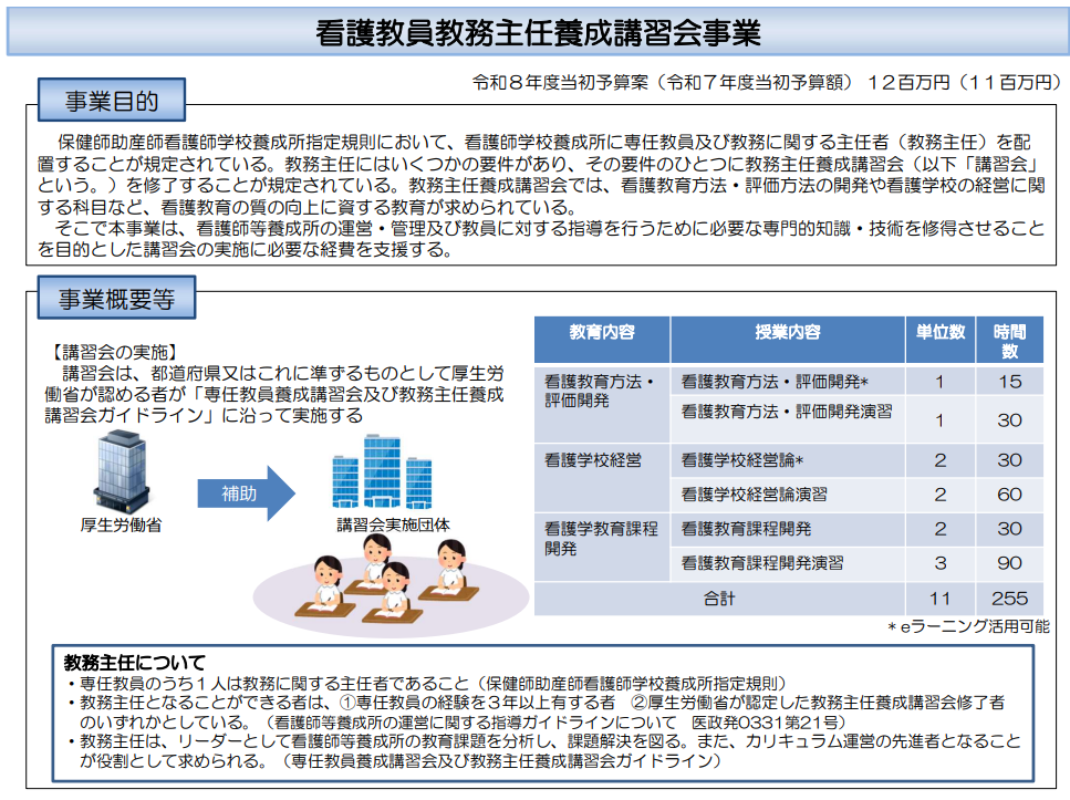◆看護教員教務主任養成講習会事業(令和8年度予算案12百万円)