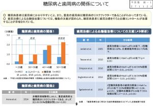 6May2017糖尿病と歯周病の関連について2017年5月6日2443約1分データ解説糖尿病と歯周病には相互に因果関係があり、歯周病の罹患が糖尿病のリスクを高めます。 成人での歯周病の有病率は7-8割と高いことから、健康診断で歯科健診などを積極的に導入し、歯周病だけでなく、糖尿病の予防に努めていく必要があります。 出典:平成29年4月19日(水) 医療と介護の連携に関する意見交換会