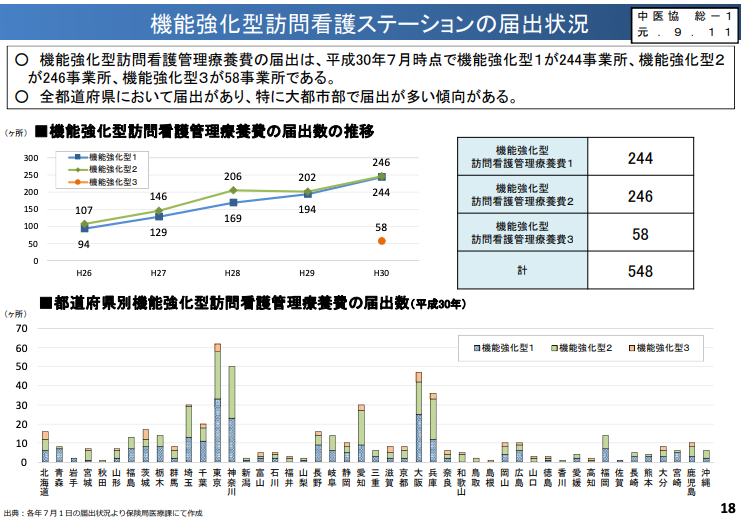 11Dec2019【政策資料集】機能強化型訪問看護ステーションの届出状況2019年12月11日1882約1分データ解説機能強化型訪問看護ステーション(所属人数が多く、重症度の高い患者を多数受け入れているもの)は増加していますが、都心部に集中している傾向にあります。地方においても、重症患者を看られる体制づくりを後押ししていく必要があります。 厚生労働省 令和元年11月20日(水) 中央社会保険医療協議会 総会(第434回)
