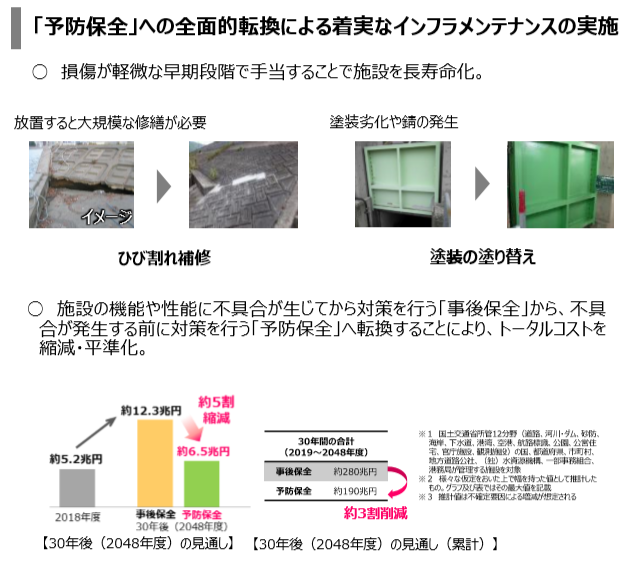 25Feb2020【政策資料集】予防保全への転換による着実なインフラメンテナンスの実施2020年2月25日2043約1分データ解説道路やトンネルなどのインフラについて、機能・性能に不具合が生じてからの「事後保全」よりも不具合が発生する前に対策を行う「予防保全」のほうが約5割のコストカットを見込めます。損傷が浅い早期段階での手当を進めることが大切です。 国土交通省 令和元年 11 月 21日 社会資本整備審議会 計画部会